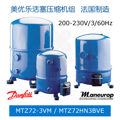 批發零售原裝進口法國制造丹佛斯Maneurop/美優樂活塞壓縮機MTZ72-3VM,MTZ系列,單機設備,200-230V/3/60Hz,制冷劑:R407A、R407C、R407F、R134a、R404A/R507A,制冷量:11900W,提供美優樂壓縮機MTZ72-3VM型號、規格、參數、圖片、價格等數據。